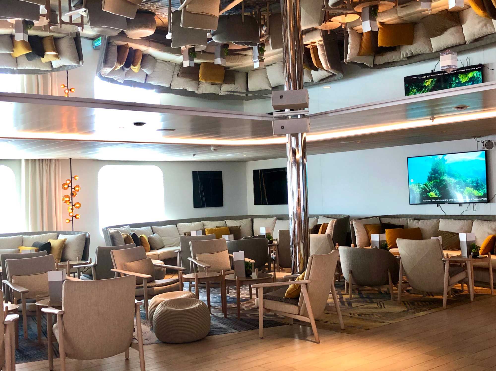 Implanté sous la coque des yachts, le salon Blue Eye sera accessible à l’ensemble des passagers. Ces derniers pourront percevoir au mieux l’univers sous-marin et se présenteront comme des explorateurs des temps modernes dans le sillage de Jules Verne et Jacques-Yves Cousteau. Pour mettre au point ce concept innovant, Ponant s’est rapproché de Jacques Rougerie, architecte académicien passionné de la mer. Ce dernier a façonné le salon Blue Eye dans les moindres détails pour permettre aux passagers de rentrer en immersion au sein des milieux sous-marins. L’architecte a notamment disposé deux hublots en forme d’œil de cétacé qui offrent une vue sur le monde subaquatique. De plus, des écrans digitaux intégrés sur les murs du salon permettront aux passagers de visualiser la vie sous-marine en direct grâce à trois caméras. Enfin, Ponant a collaboré avec Michel Redolfi pour concevoir l’ambiance sonore du salon Blue Eye. Le compositeur de musique contemporaine a apporté sa touche à cette expérience multisensorielle en s’inspirant de ses recherches en musique subaquatique. Des hydrophones (microphones qui s’utilisent sous l’eau) permettront de capter les sons des fonds marins dans un rayon de 5 kilomètres.